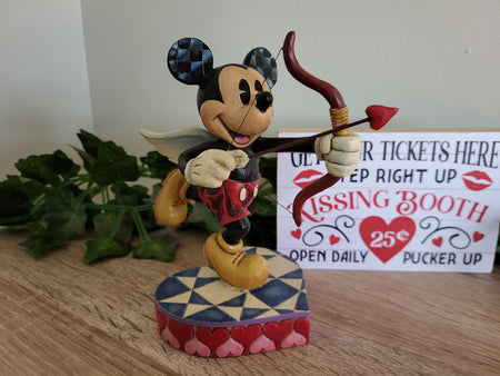 Add a touch of Disney romance to your collection with the Mickey Mouse Cupid “Love Is In The Air” figurine from the Disney Traditions collection by Jim Shore. This beautifully hand-painted piece features Mickey Mouse in a playful Cupid pose, aiming his bow while standing on a heart-shaped base, complete with angel wings.